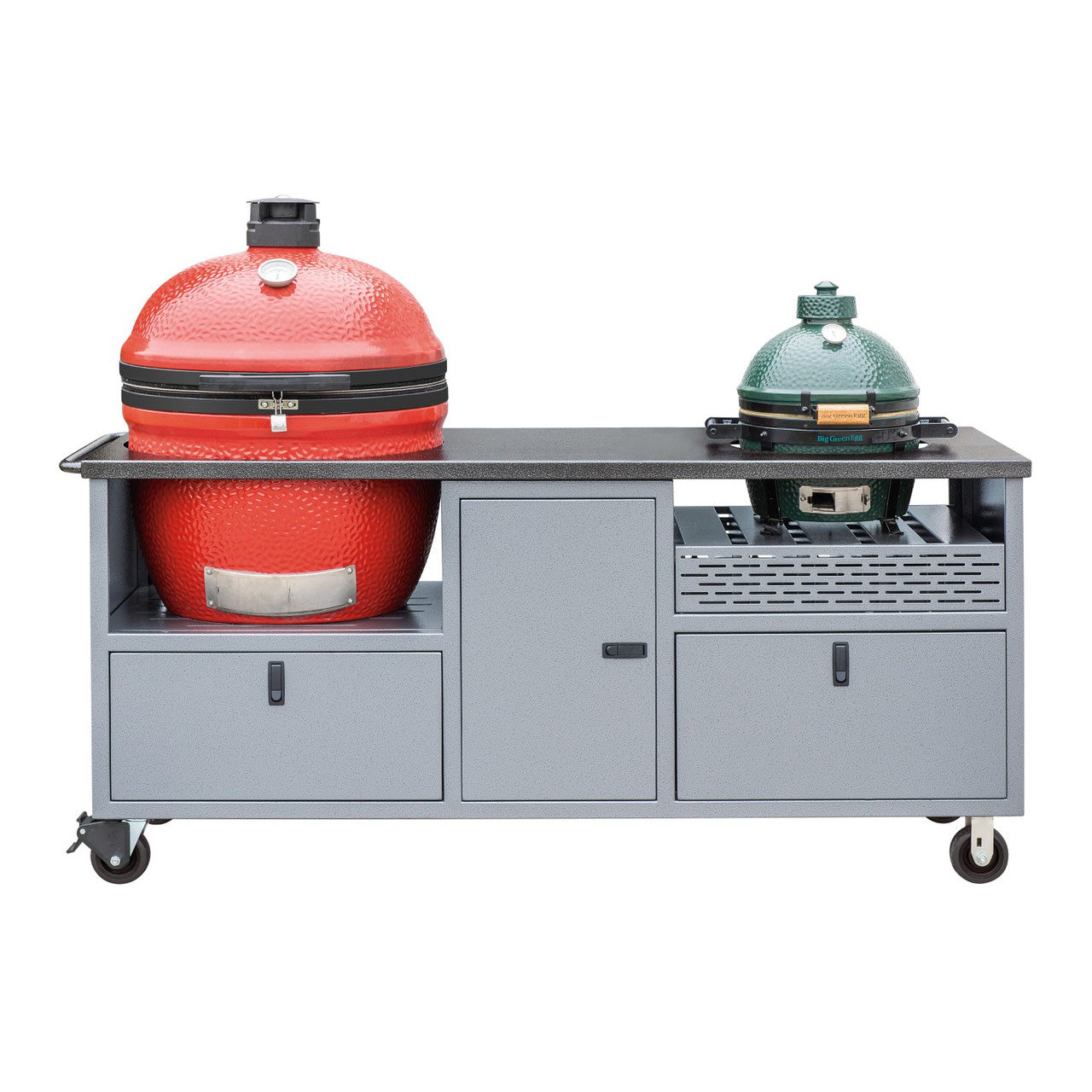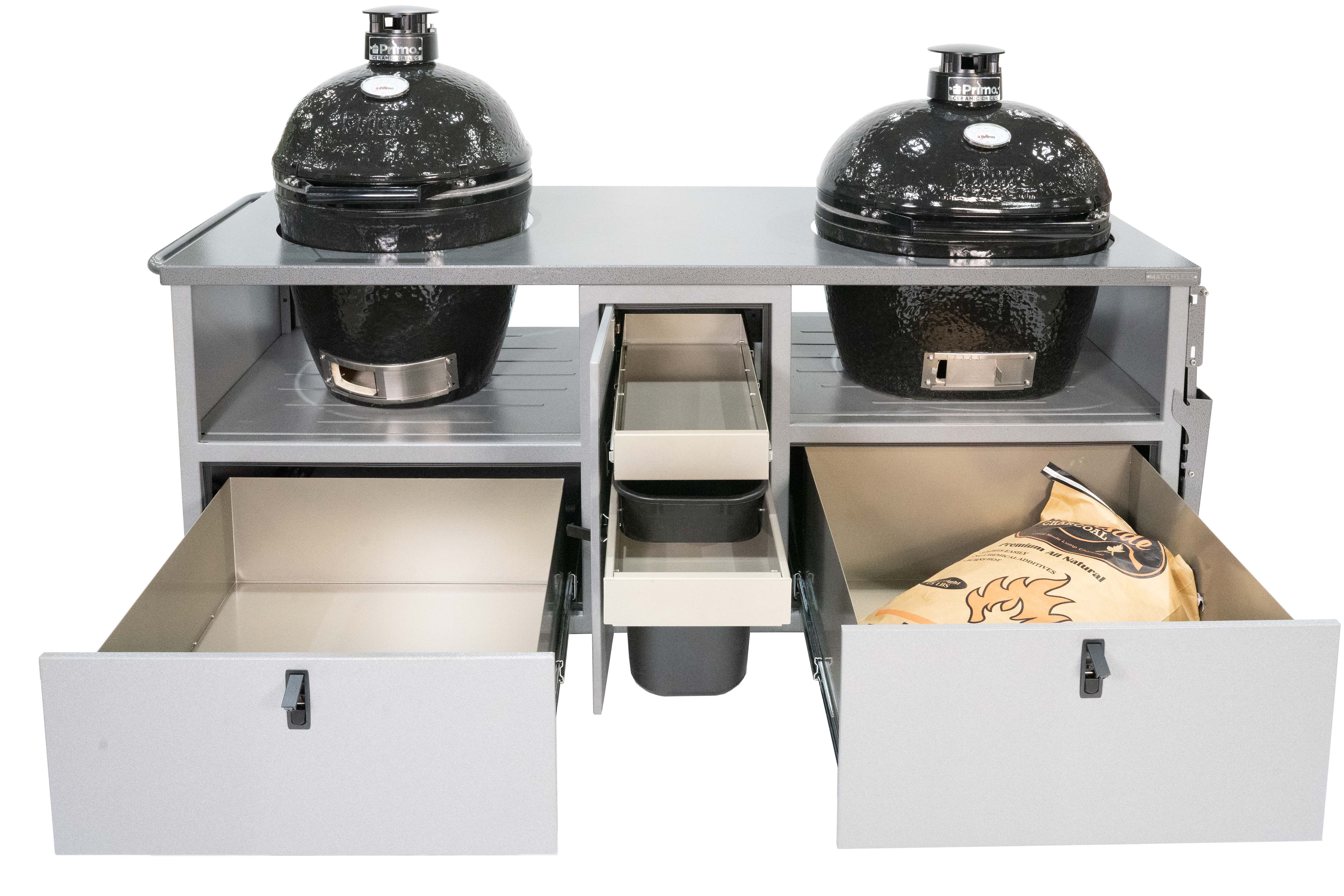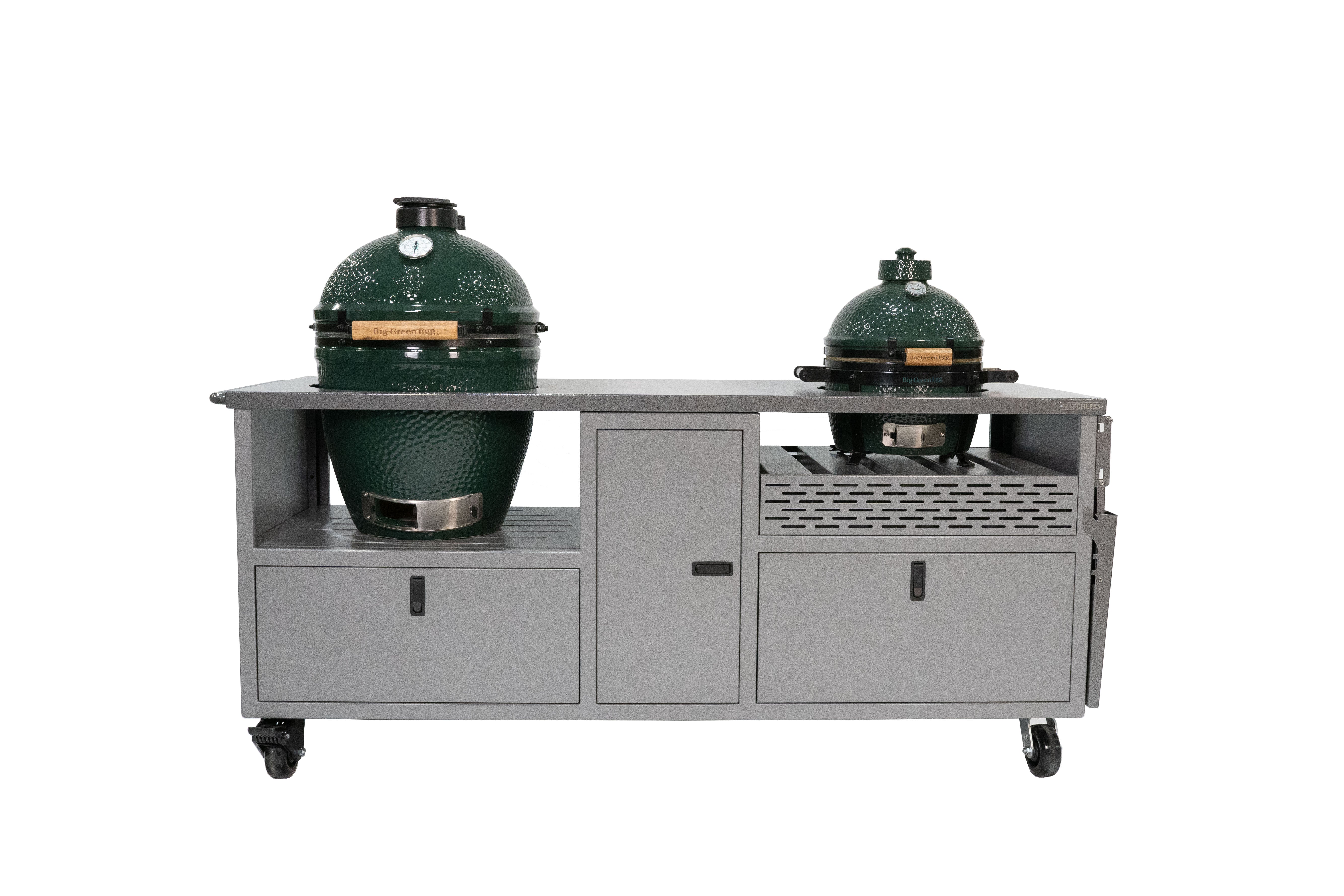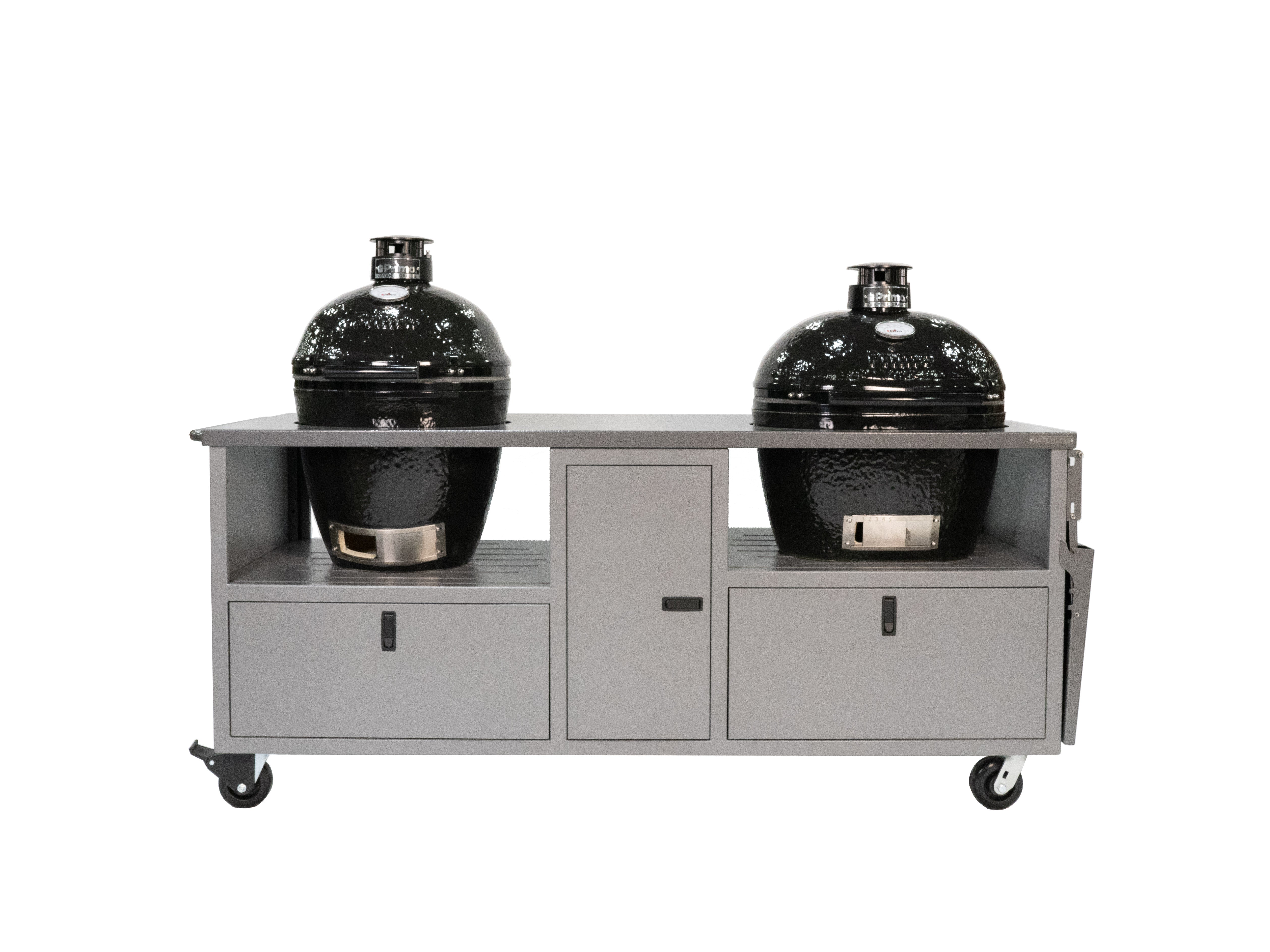 The only thing better than one ceramic grill is two! Our Duo Cart can handle any two ceramic grills with room to spare for charcoal, tools, and more. Grills not included.