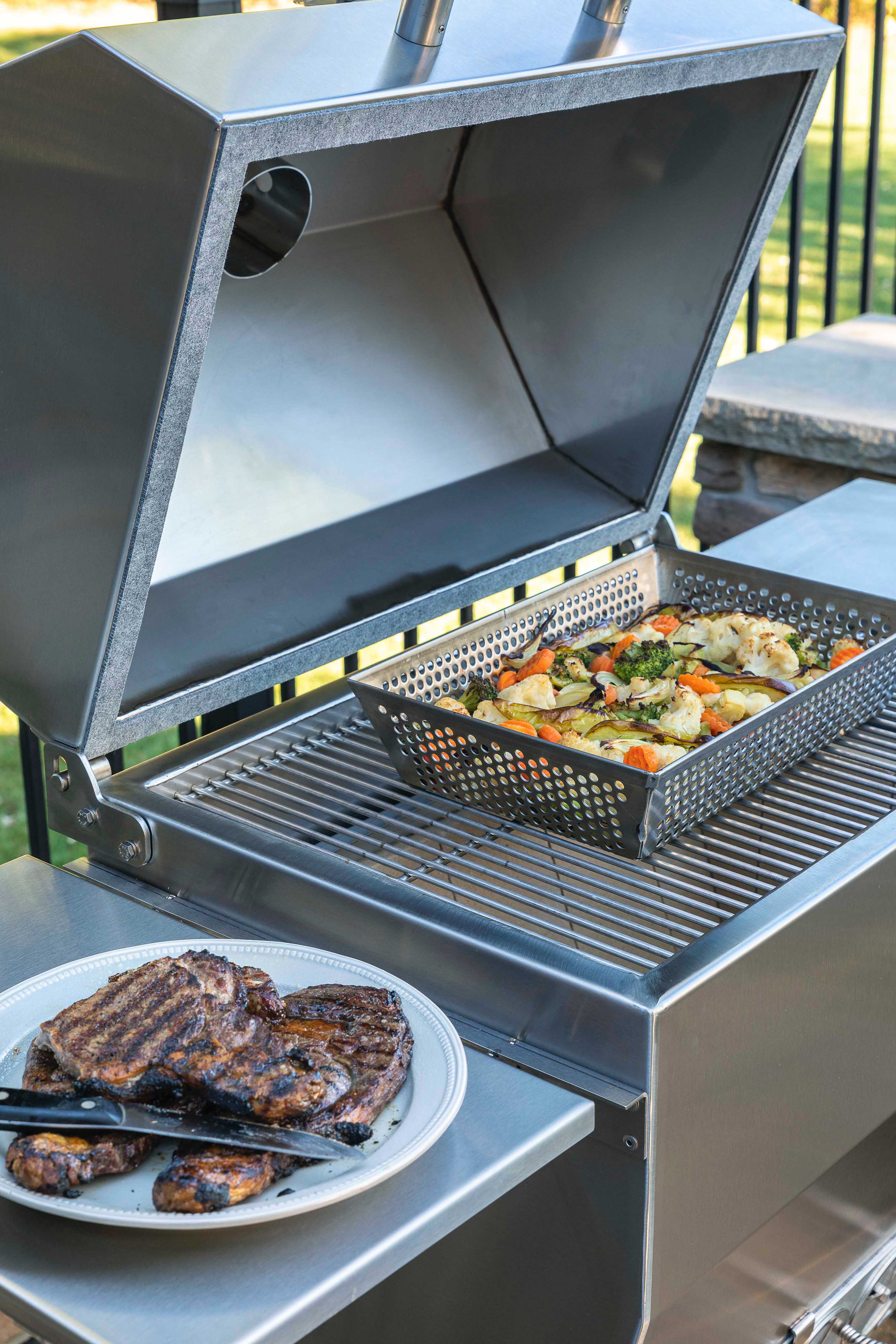 - Includes Ash Scraper, Grill Tool, Base with Casters, Stainless Steel Shelves with Utensil Hooks, and the removable vent plate.